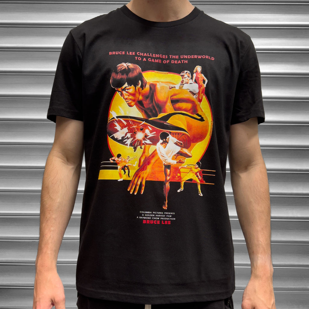 Dieses T-Shirt ist eine Hommage an den Film Game Of Death mit Bruce Lee in der Hauptrolle, wenn auch in reduzierter Form. Dieser Film, der nach dem Tod von Bruce Lee fertiggestellt wurde, zeigt viele andere Filmschauspieler, die oft überhaupt nicht wie Bruce Lee selbst aussehen - aber die Kampfszene dieses Films ist das, worum es geht.