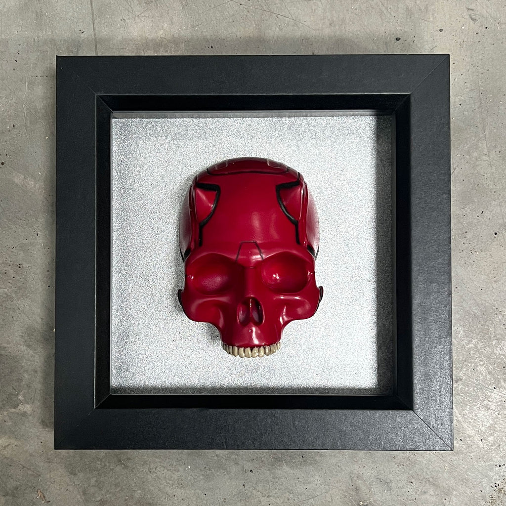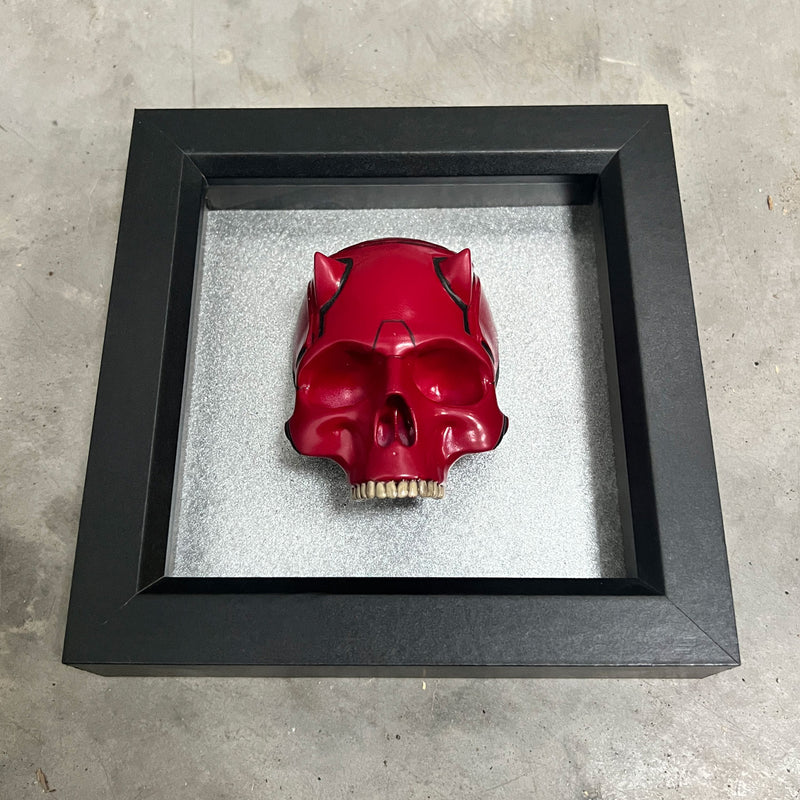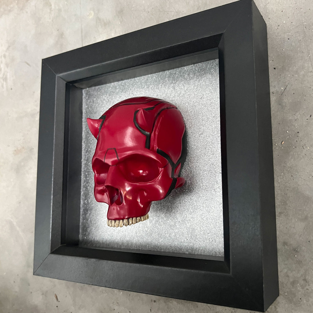 Inspired by the gritty, noir aesthetic of Marvel’s Daredevil TV series, this bold and striking Skull Mask Display pays homage to the Man Without Fear’s iconic presence in Hell’s Kitchen. Set in a compact 11cm x 11cm deep black box frame, this handcrafted piece blends comic-book intensity with urban gothic flair.