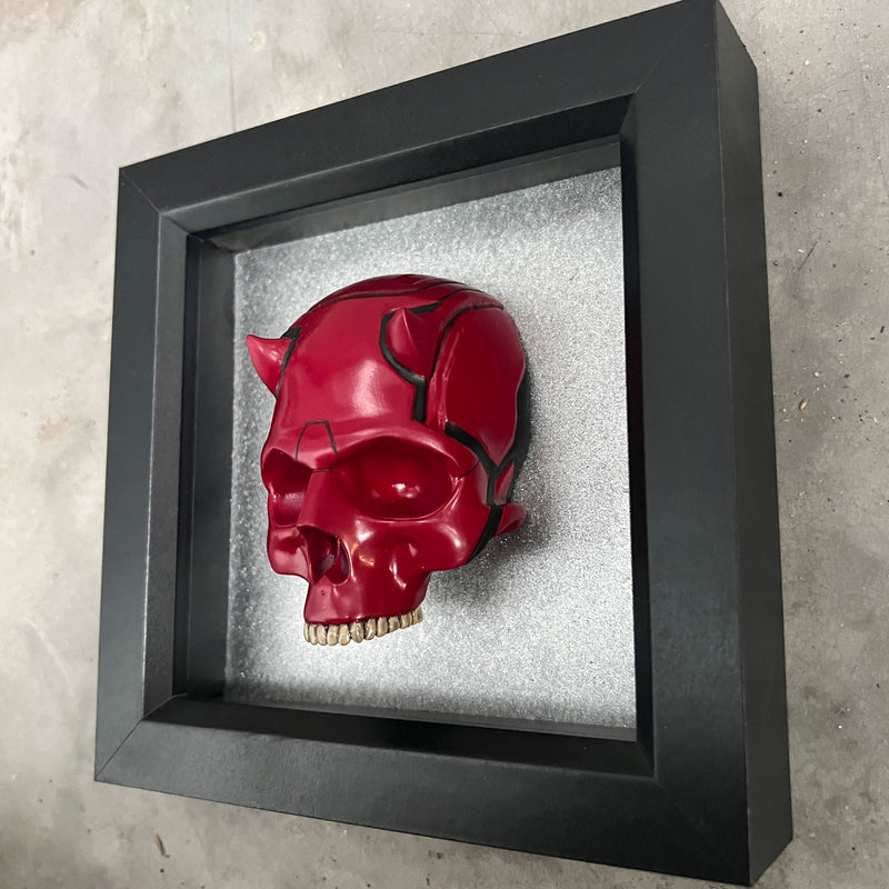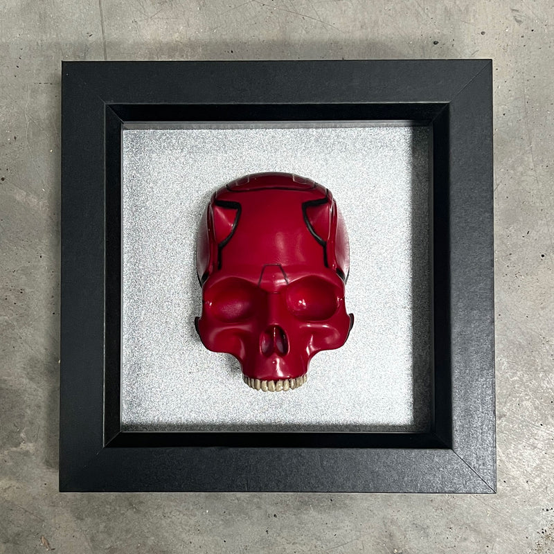 The vivid crimson skull, complete with sculpted devil horns and deep black detailing, echoes Daredevil’s armored persona and internal conflict.
