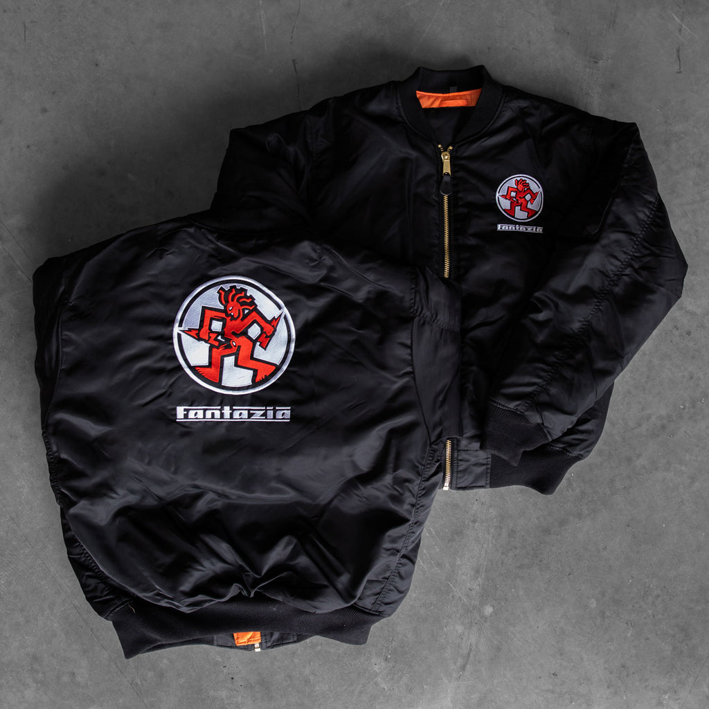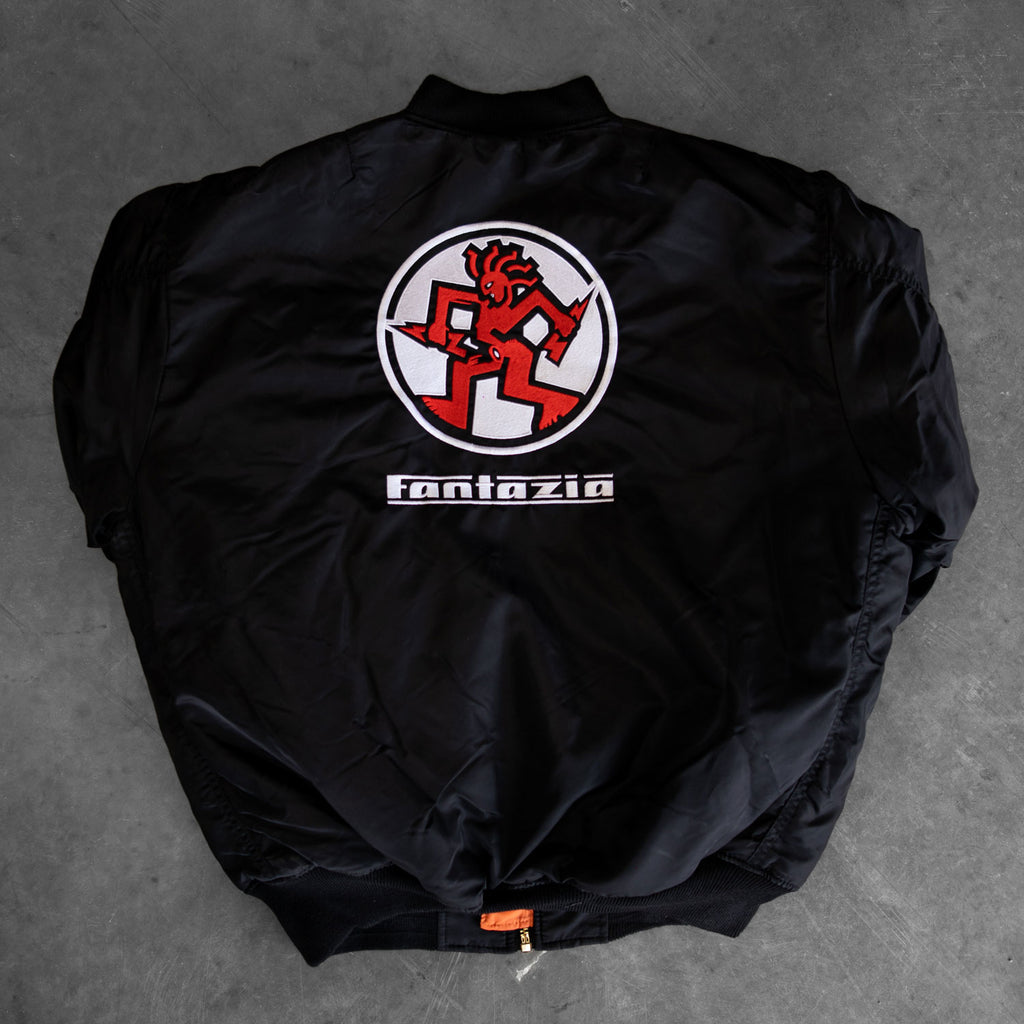 Die Basisjacke ist eine Brandit MA1 und hat ein vollständig gesticktes Brust- und Rückenlogo in Rot. Diese Jacke wird auch die Stickerei auf der Innenseite aufweisen (genau wie die Jacken aus der goldenen Ära des Rave).