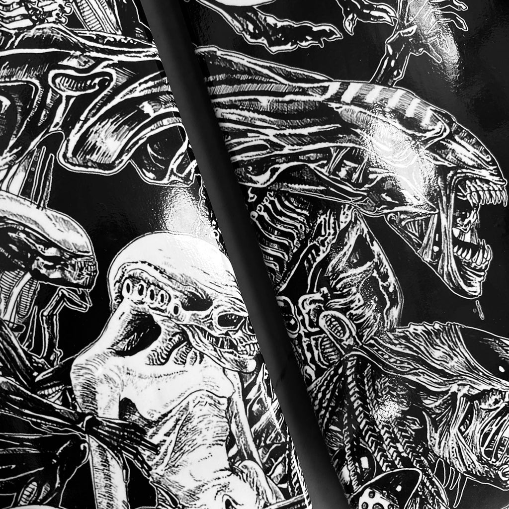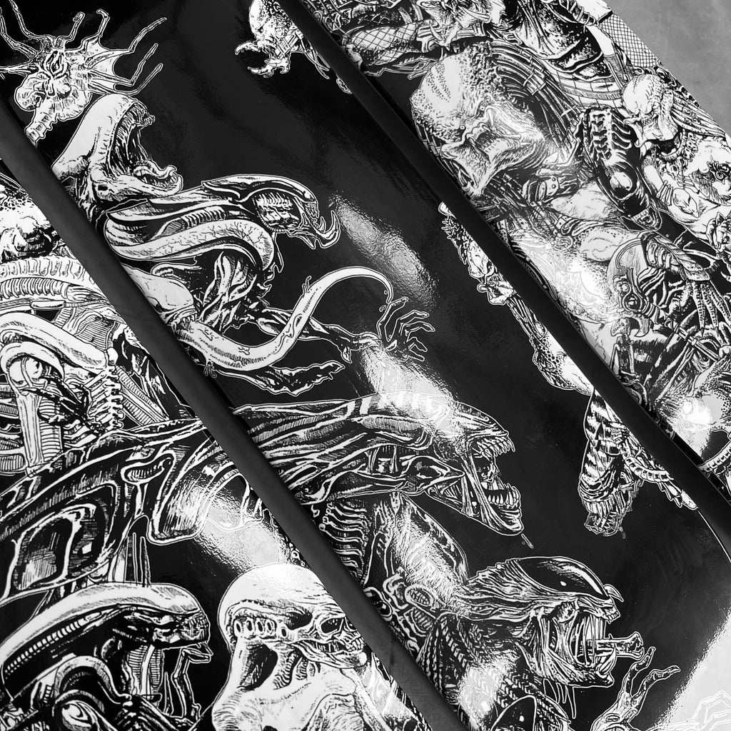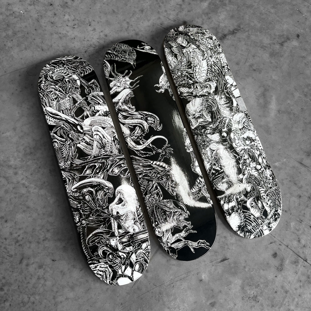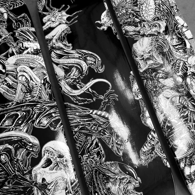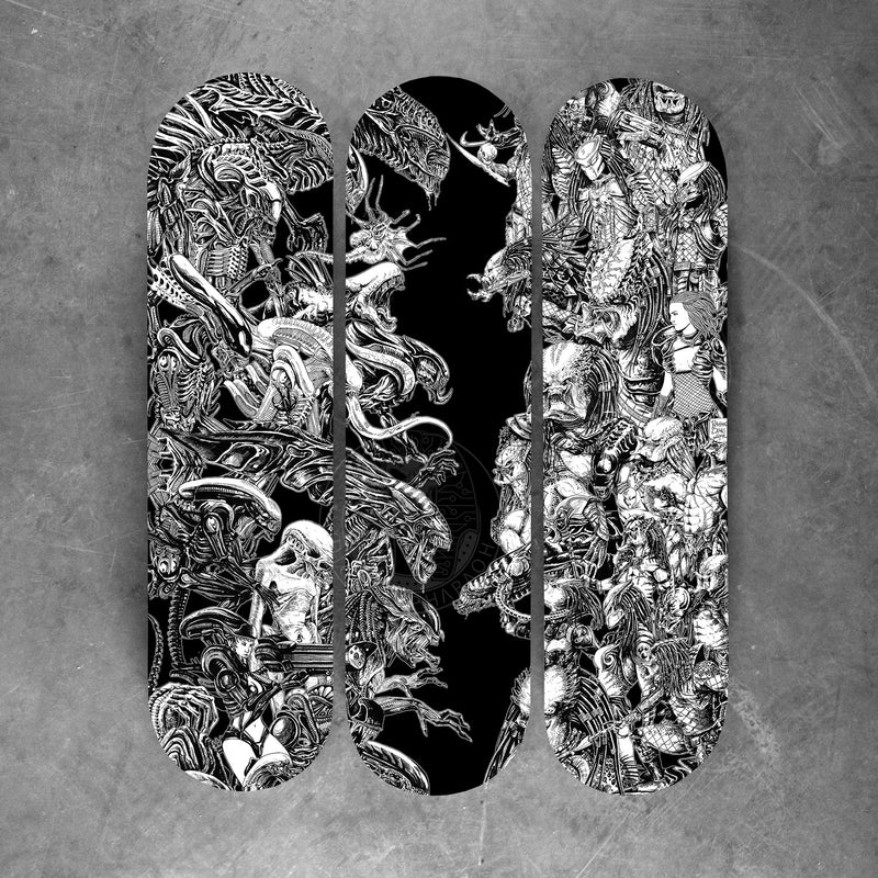 With every conceivable Alien and Predator creature to ever grace our screens pretty much present on this epic 3 up skate board wall art|! Featuring the artwork from the incredibly skilled Rachmad Basoeki, this design is a next level face off between the 2 most awesome Aliens in the universe!