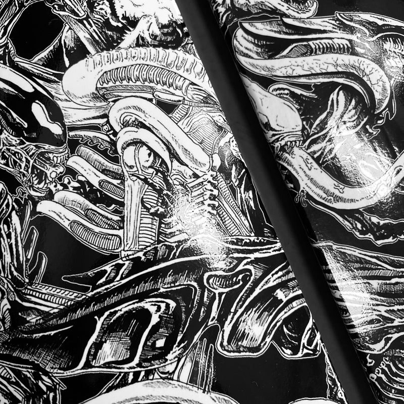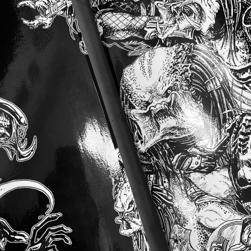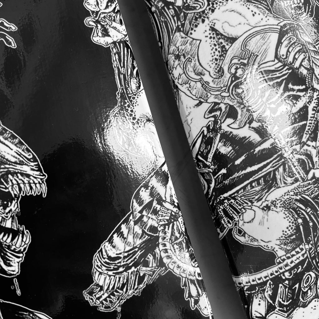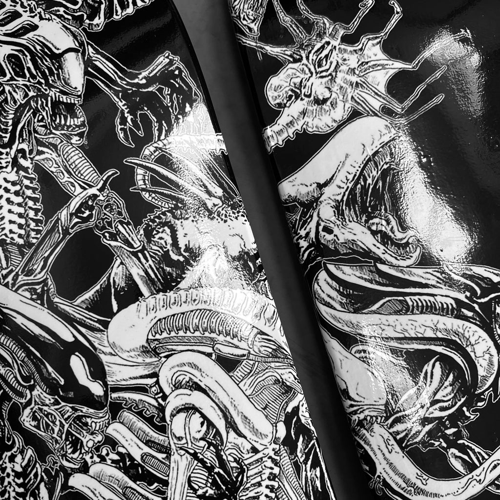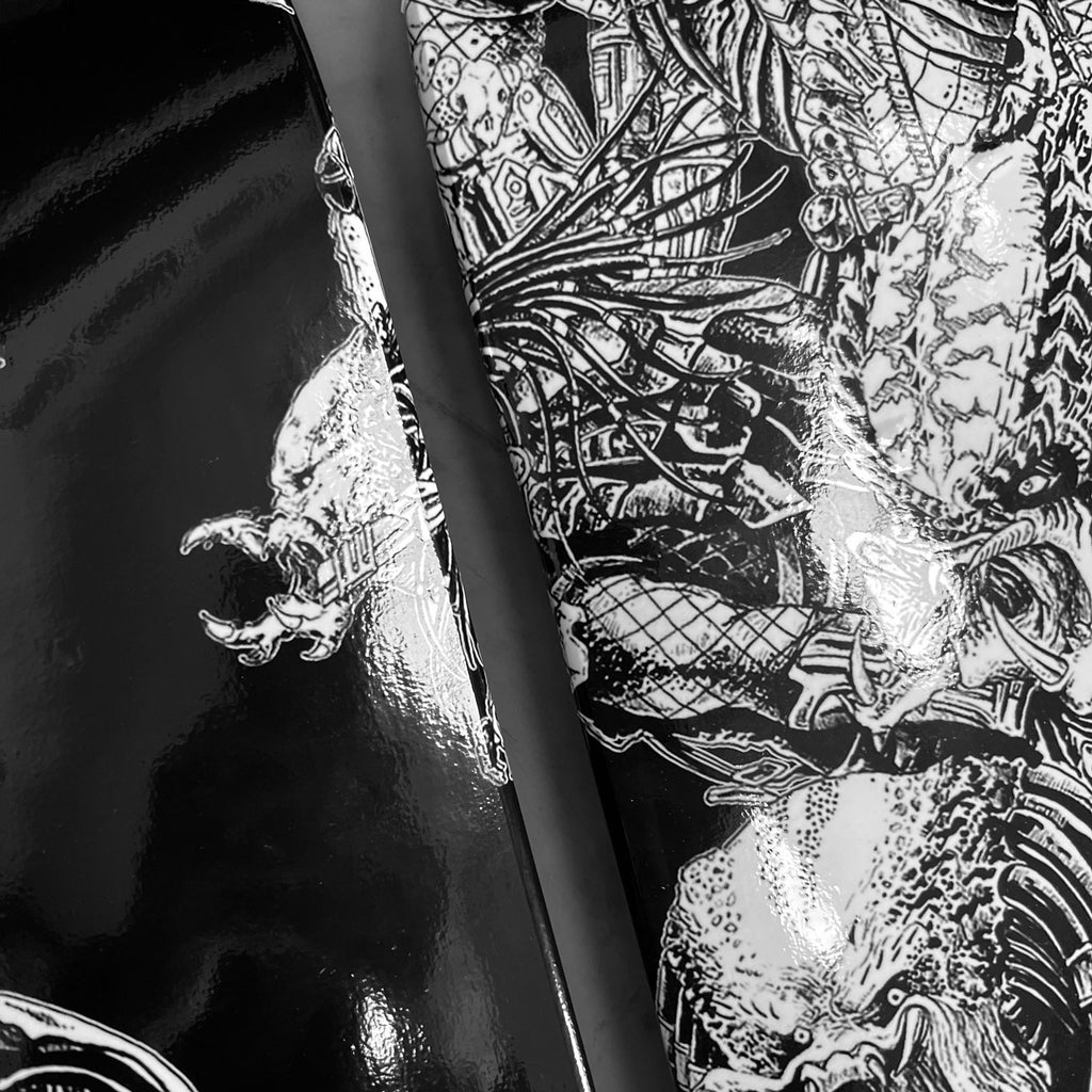 With every conceivable Alien and Predator creature to ever grace our screens pretty much present on this epic 3 up skate board wall art|! Featuring the artwork from the incredibly skilled Rachmad Basoeki, this design is a next level face off between the 2 most awesome Aliens in the universe!