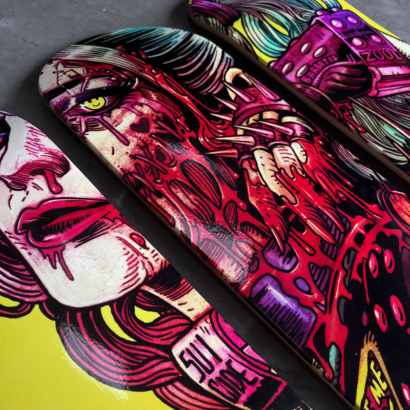 This awesome 3 x skate deck wall art piece, features 8 layers of maple wood fused together with a double concave design. Each deck measures 79cm x 20cm x 5.5cm and is perfect for hanging on your wall or building up with your own trucks to actually grind out some action!