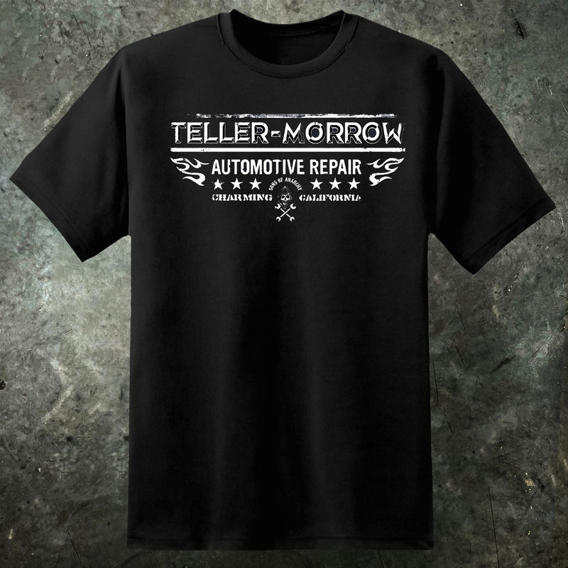 This Sons Of Anarchy inspired t shirt features the name and title of the Californian MC garage "Teller Morrow".