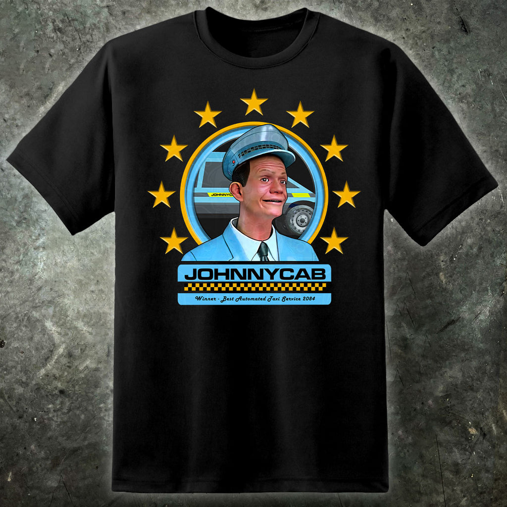 This mens total rekall t shirt features the image of the incredible Johnny Cab driver as seen in the original 80's film starring Arnold Schwarzenegger as the undercover spy Douglas Quaid.