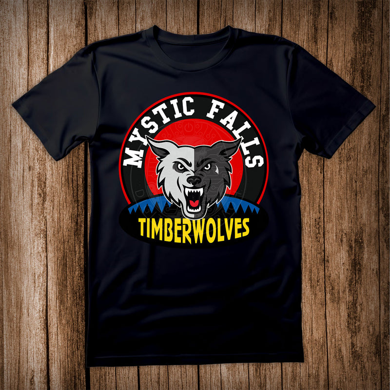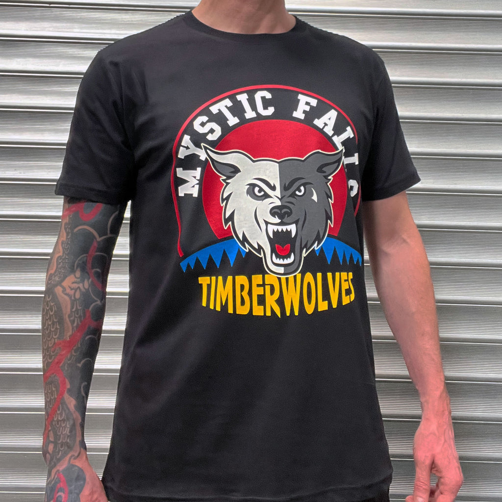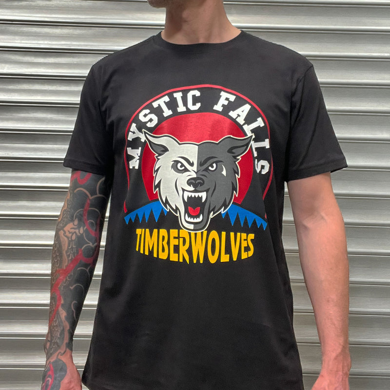 Unleash your supernatural spirit with our Mystic Falls Timberwolves T-Shirt, as seen in The Vampire Diaries. Featuring the bold, iconic Timberwolves logo with the fierce half-white, half-grey wolf design and retro-style lettering, this tee is perfect for fans of the hit series and those who run with the pack.